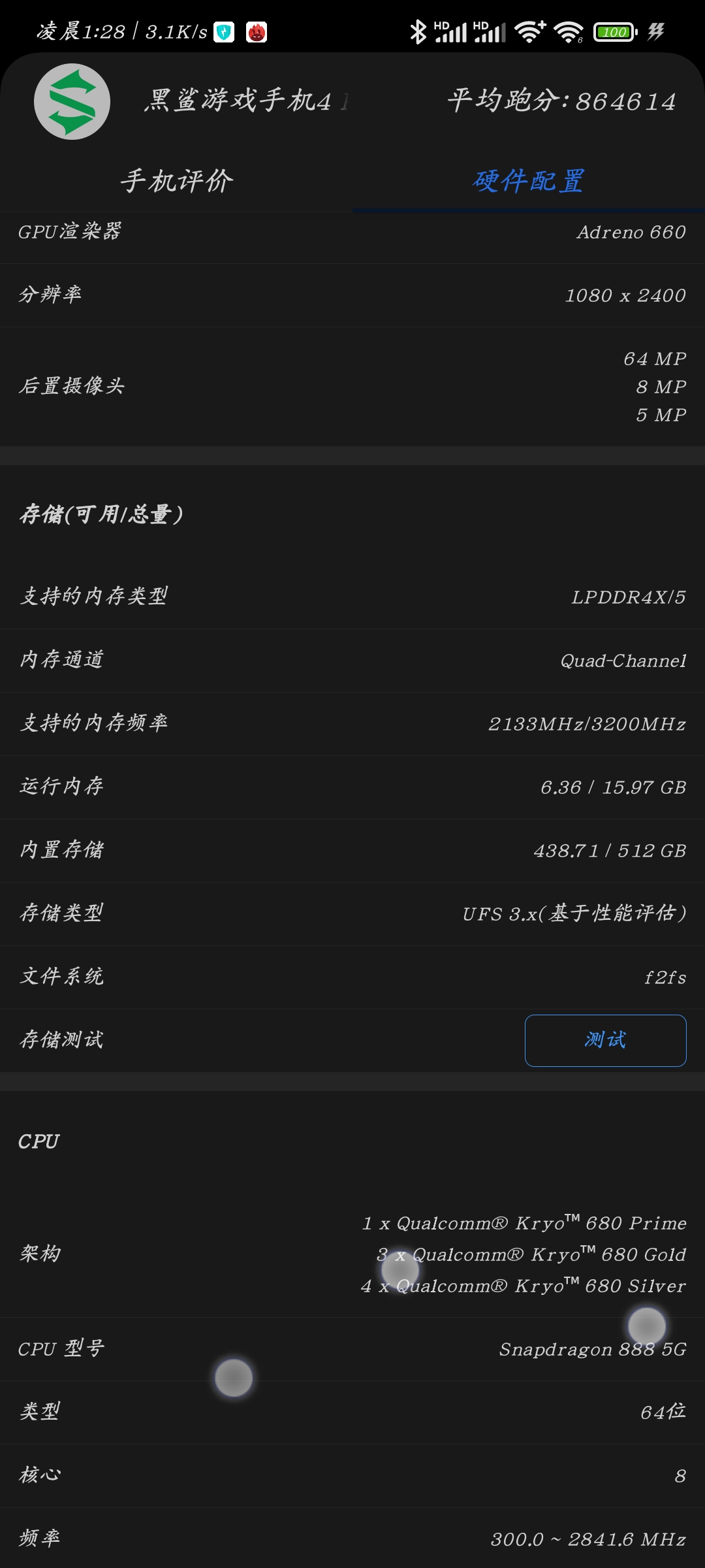 对黑鲨4PRO重置后,用了几天进行安兔兔跑分,闪存终于从ufs2.x回顾ufs3.x,进游戏确实比以前快。以前ufs确实是2.0的那个性能,但是现在能够感觉到是ufs3.1增强版性能。
