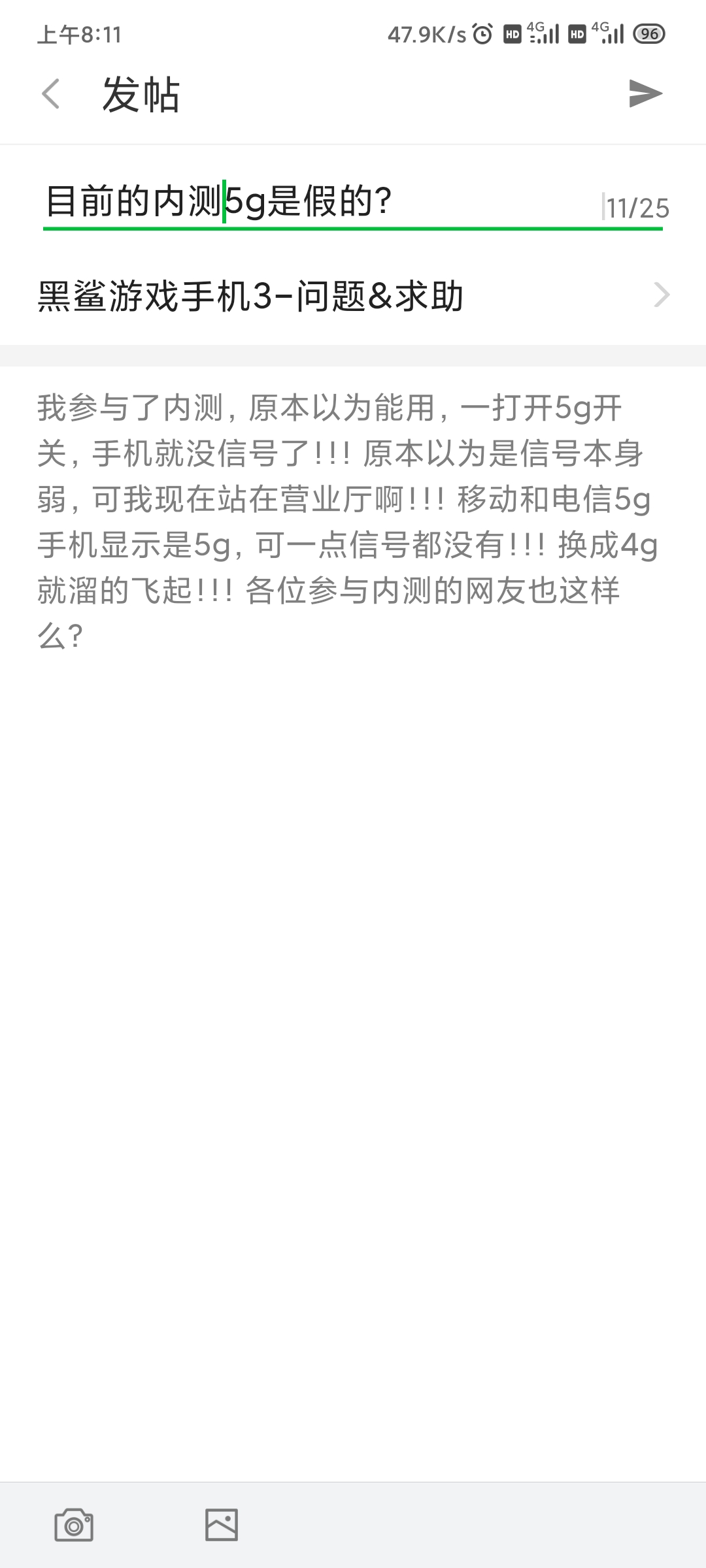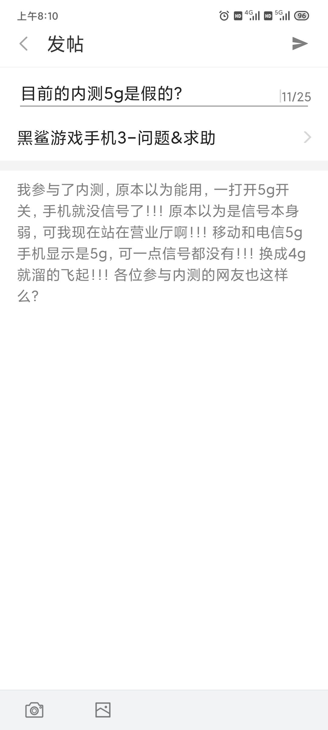 我参与了内测,原本以为能用,一打开5g开关,手机就没信号了!!!原本以为是信号本身弱,可我现在站在营业厅啊!!!移动和电信5g手机显示是5g,可一点信号都没有!!!换成4g就溜的飞起!!!各位参与内测的网友也这样么?