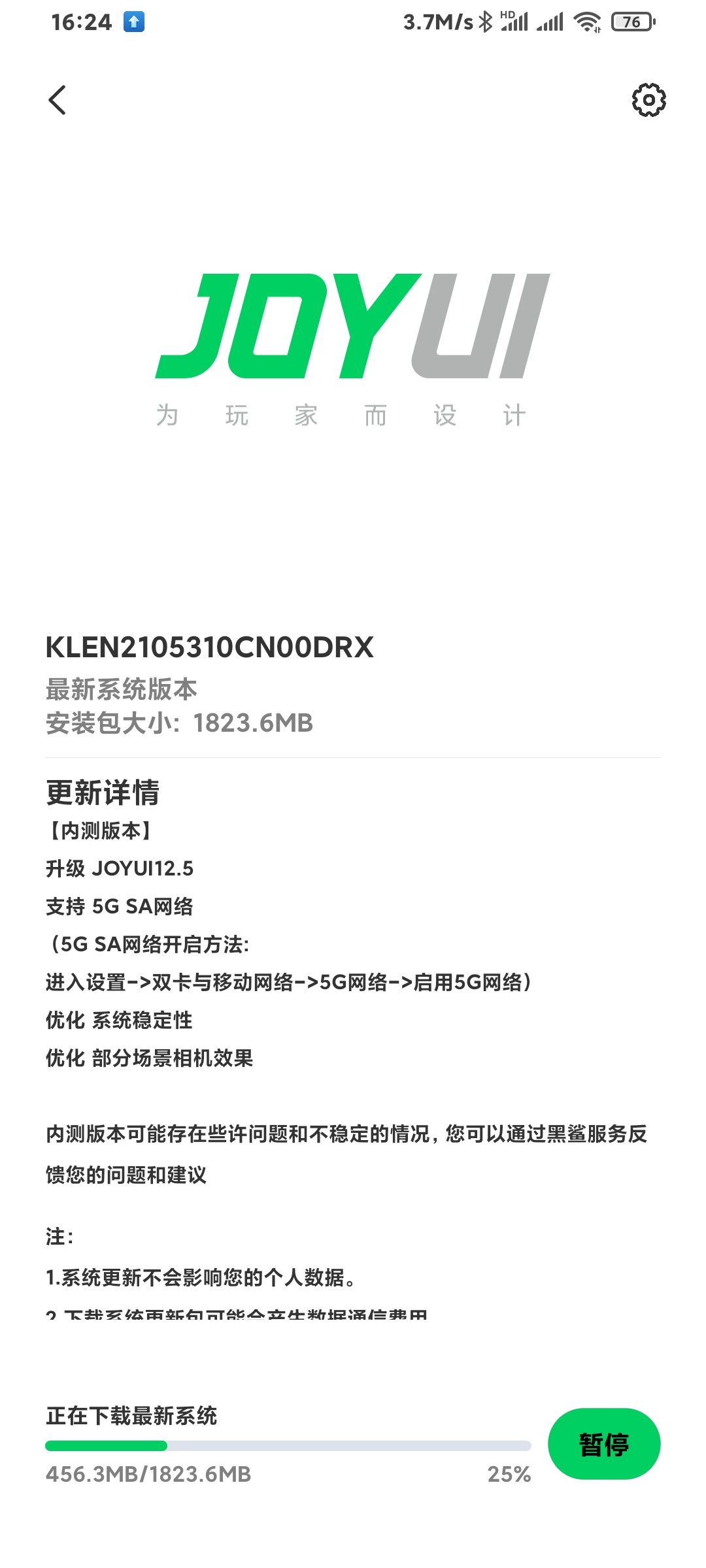 目前黑鲨3/黑鲨3Pro/黑鲨3S 内测JOYUI12.5系统正在推送中,请各位更新好后,有问题及时反馈社区或黑鲨服务客服!如果还没收到推送,请耐心等待!
