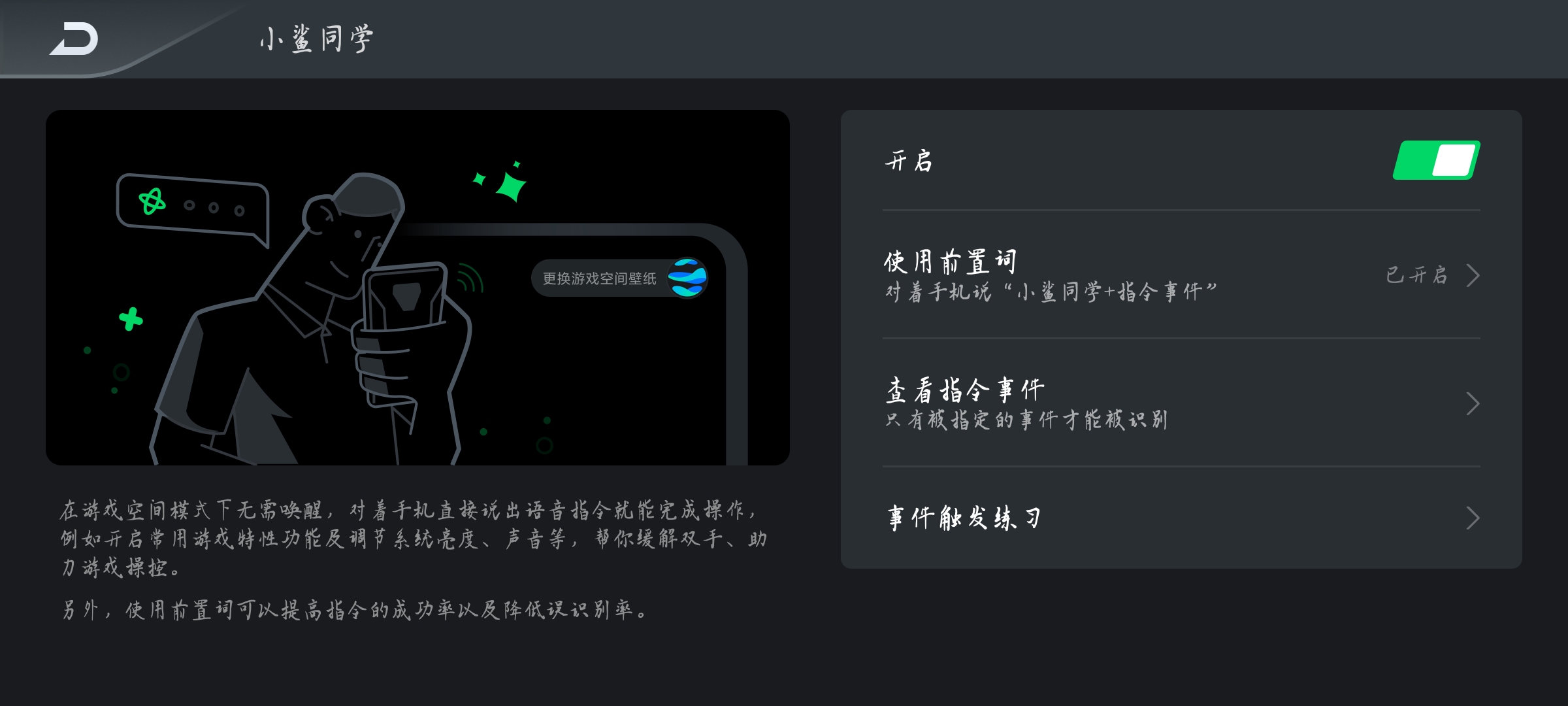 是按照提示“小鲨同学”+指令说的吗,如多次尝试仍无效果,可以尝试重启下手机。或者在黑鲨服务中反馈一下