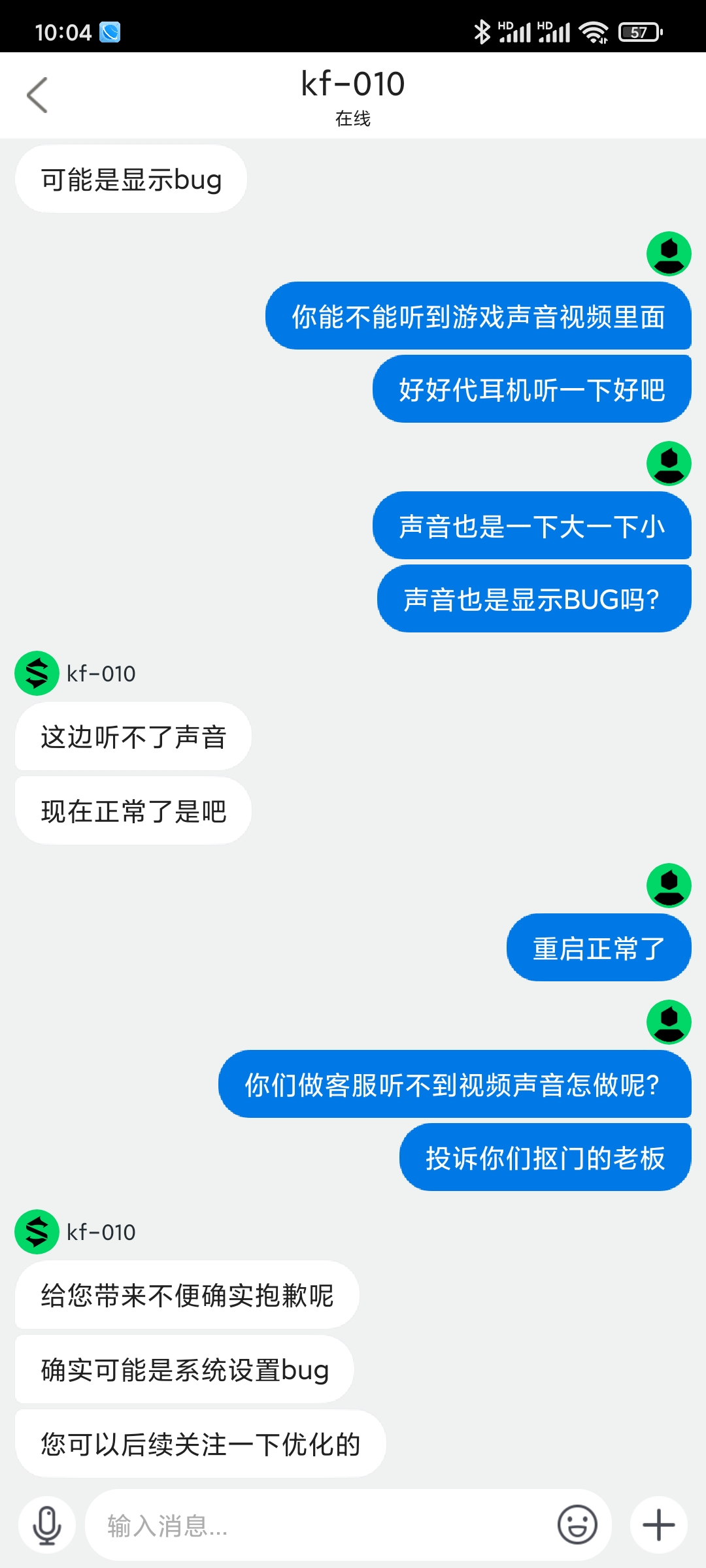 一个专门做游戏手机的厂家,系统BUG多不说,起码反馈的BUG要可以收到吧,发个视频过去,客服连个耳机都不给配,全靠盲猜,只能看到视频内容,听不到视频声音,绝了,游戏那么多款,你就对你自己的手机游戏声音这么自信吗?明明系统问题,非要盲猜告我显示问题,牛批👍抠门老板,差评